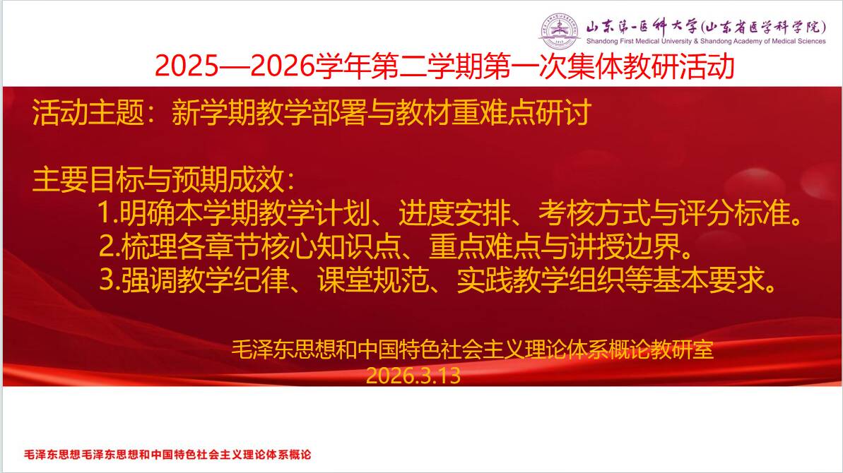 为扎实推进新学期思政课教学高质量开展,统一教学标准、明确教学重点、强化育人实效,3月13日,毛泽东思想和中国特色社会主义理论体系概论教研室开展2026年春季学期第一次集体教研活动,教研室全体教师参会。